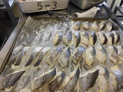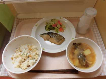 ☆今日の献立は『鰆の梅肉焼き』です。焼いたさわらに梅肉だれをかけました。酸味はあまり感じず梅の香りを楽しむことが出来ます。今日も給食室のオーブンでたくさん焼きました。