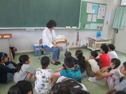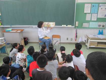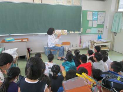 「おおかみだって きをつけて」「Dad Papa Pop(おとうさん・パパ・おとうちゃん)」という本を読んでいただきました。子どもたちは、集中して興味をもって聞いていました。英語で話したり、その説明をしたりしていただきました。本にも、英語にも少しでも興味をもってほしいなと思います。 お忙しい中、ありがとうございました