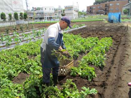 吉岡農園にじゃがいも掘りに行きました。吉岡農園は歩いて10分のところにあります。今日はとても暑くなりましたが、みんなで歩いていきました。