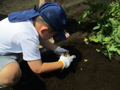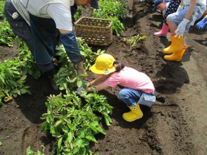 最初に吉岡さんがじゃがいもの堀り方を教えてくださいました。説明が終わると、いよいよみんなが掘る番です。一人二株、じゃがいも掘りに挑戦しました。まず茎を引っぱり、それから土を掘ってじゃがいもを探します。一株から10個ぐらいのじゃがいもが採れました。「とれたよ。」「あった。」と子どもたちから声があがりました。
