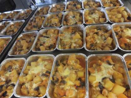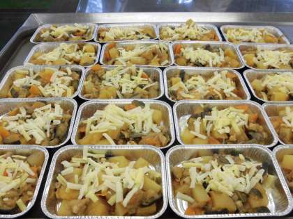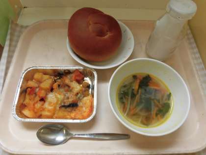 ☆今日は『なすとポテトグラタン』です。今が旬のなすを使用しています。子どもたちが食べやすいように、なすを小さく切り油で揚げました。そして、じゃがいも たまねぎ 鶏肉と揚げたなすを加えケチャップを加えて味付けをしました。グラタン皿に具とチーズをのせてオーブンでこんがり焼きました。