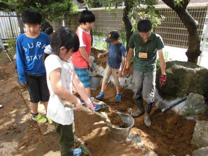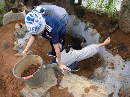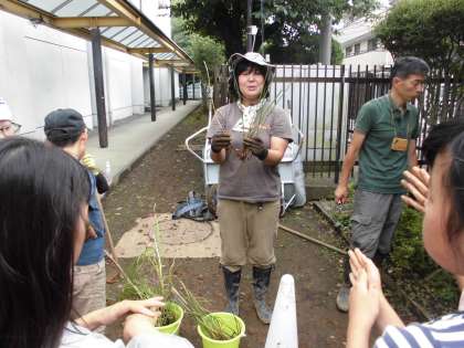 7/8にエコ委員会でビオトープ作りを行いました。ビオトープギルドの方々の指導のもと、関東ローム層の土で池の底や周りを固めました。次に多摩川水系で生えている水草を池に植えました。水草の中には「サジオモダカ」など東京都の絶滅危惧種に指定されているものも含まれています。