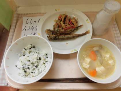 ☆今日の給食は『ししゃものごまフライ』です。ししゃもは、クセがなくて食べやすく、プチプチとした卵の食感が特徴です。今日は子どもたちに、ししゃもを頭からパリパリ食べていただきました。