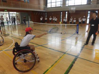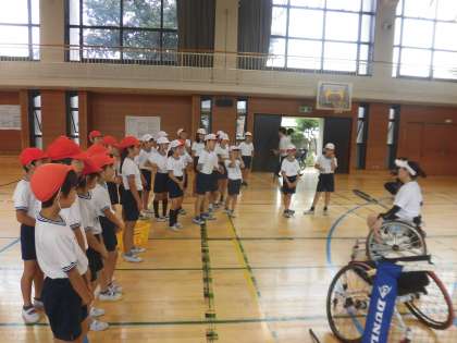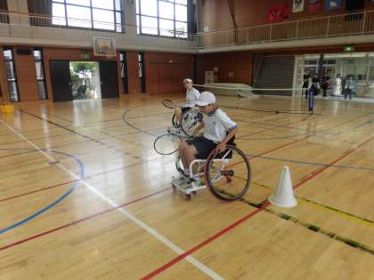 2・3・4校時に各クラスで車いすテニス体験を行いました。片手にラケットを持ち、競技用車いすに乗って前に進みましたが、悪戦苦闘、、、。「ラケットで操作できない」「曲がるのが難しい」と声が聞こえてきました。実際にボールを打つ体験も行いました。難しいと感じながらも、ネットの向こう側にボールを返していました。車いすテニスは5年生にとって、貴重な体験となりました。