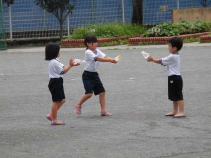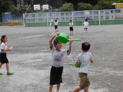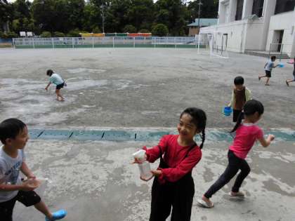 1年生は、生活科で水遊びをしました。ペットボトルやバケツ、ソースやシャンプーの容器などを使って、お友達と水を掛け合いました。たくさん水を掛け合って、みんなずぶ濡れになりました。「今までこんなに濡れたことがなかったから、おもしろかった!」と嬉しそうに話してくれました。晴れの日が少なく、なかなかプールに入れませんでしたが、水遊びで楽しめてよかったですね。