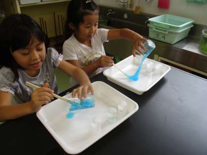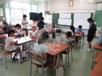 今日から3日間、サマースクールが行われます。今日は、「理科実験(スライムづくり)」「タブレット・PC(暑中見舞いづくり)」「百人一首」「卓球」「硬筆」「アートエコバッグ」の6教室が行われました。講師の先生だけでなく、上祖師谷中学校の中学生もボランティアでみんなを助けてくれました。きのうと今日とプールが中止になったため、夏休みに入って久しぶりの学校となりましたが、子どもたちは楽しく活動していました。