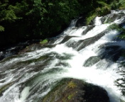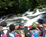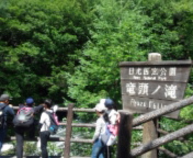 10時、竜頭の滝に着きました。これからハイキングの出発です。青空の下、緑のよさをたっぷり味わってほしいです。まずは、竜頭の滝の水しぶきを感じました。