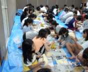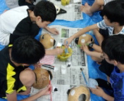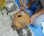 19時15分、栃木県の伝統的工芸品のふくべ細工を作る体験をしました。ふくべとは夕顔の実のことで、その果肉をむいて干したのがかんぴょうです。子どもたちは、ふくべの形から発想したものを思い描き、くりぬいたり色をつけたりして、個性的な作品に仕上げました。