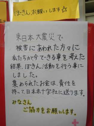 明日、登校時に5年生有志が中心となり、今回の東日本大震災の募金活動を