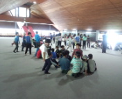 13時、ますつかみまで時間があるので、村の会堂に集まって、みんなで楽しく室内レクリェーションをしました。会堂はビレッジの2階にある広いスペースのある場所です。みんなで楽しく盛り上がりました。