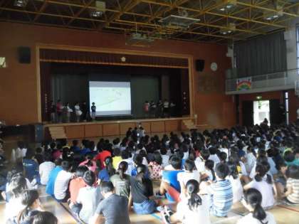 「からすのそばやさん」の読み聞かせにクイズを織り交ぜながら行った発表に、全校の子どもたちは夢中になって楽しみました。