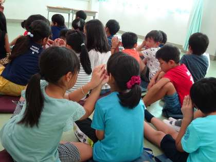 途中に、手遊びも教えてもらいました。「虫の声が聞こえるかな。」と、友達同士寄り添いあい、耳を澄ませました。