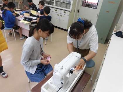 「家庭科 裁縫ボランティア」として保護者の方に、主にミシン縫いの学習補助をしていただきました。