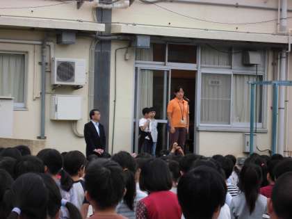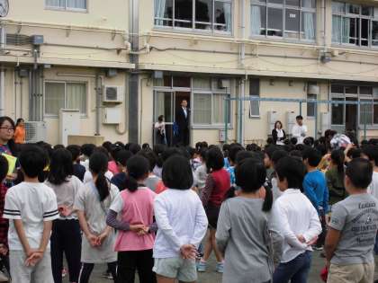 校長先生からは、ラグビーW杯の日本代表選手たちの活躍ぶり、車椅子ラグビーの快進撃にからめてお話がありました。今週の金曜日には、研究発表会があります。外部の方々へのあいさつ、めあてをもって主体的に学習に取り組むことなどを頑張ってもらいたいです。
