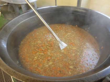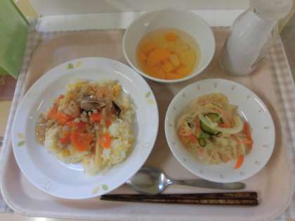 ☆今日の献立は『あんかけチャーハン』です。卵入りのチャーハンに、温かい具だくさんのあんをたっぷりかけて食べました。あんかけには 生姜 長ねぎ 人参 たけのこ 干し椎茸 えび 鶏肉などのたくさんの食材が使われています。今日も給食室の大釜でたくさん作りました。