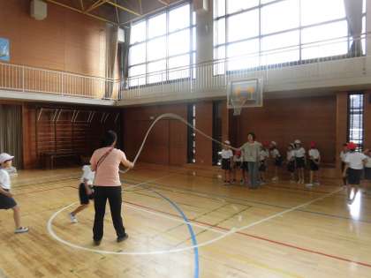 2年生は、5年生をお手本にし8の字飛びに挑戦しました。