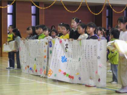 次に、3年生が1年生に教室に掲示する「校歌」を作ってプレゼントしてくれました。