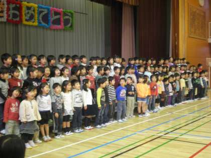 1年生が全校のみんなに挨拶と歌を歌ってくれました。