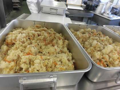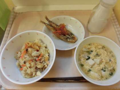 ☆今日の給食は『きのこごはん』です。きのこが苦手な子どもが多いですが、きのこは噛みごたえがあり、食物繊維が豊富です。今日のごはんには、しめじとえのきが入った旬のきのこをたくさん使いました。