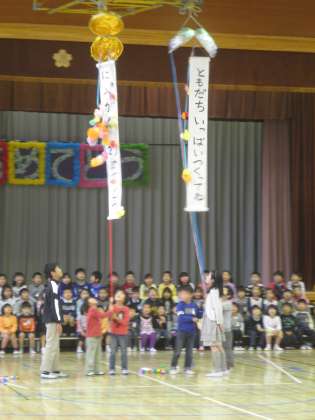 最初は、くす玉を割ります。1年生へのメッセージが書いてあります。