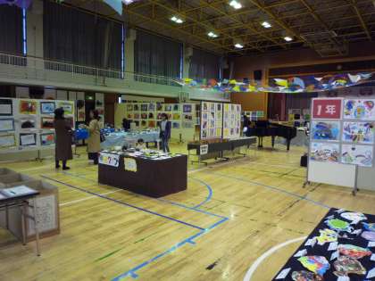 今年度は本校児童の作品、上祖師谷中学校生徒の作品、近隣保育園園児の作品、地域の方の作品の展示を行っております。また、ステージ上には世田谷区内の小学校3・4年生児童の作品によるオリンピック・パラリンピックモザイクアートの展示も行っております。