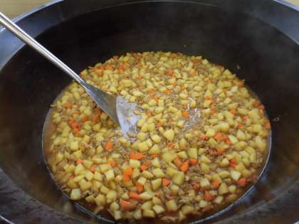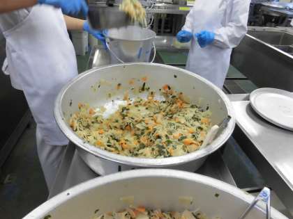☆今日は新メニューの『カレー肉じゃが』です。味は肉じゃがにカレー粉を入れて、子ども達の食べやすい辛さにしました。カレー味なのでごはんも進む1品です。給食室の大釜でたくさん作りました。