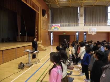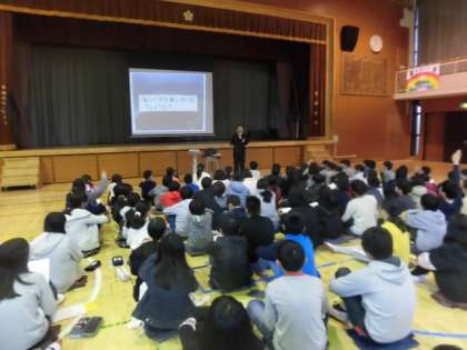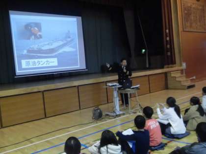 この日の4校時に、体育館にて商船三井の船長さんをゲストティーチャーにお招きしての授業をしました。