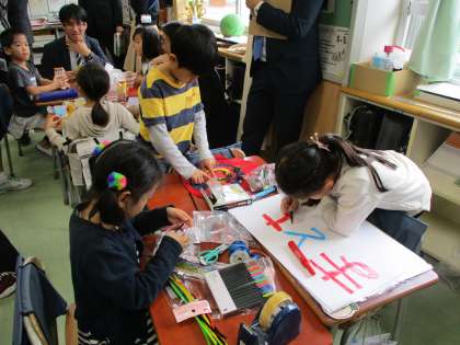1年2組は5時間目に、生活科「あきとともだちになろう」で研究授業を行いました。幼稚園生が遊びに来ることを意識して、友達と仲良くどんぐりやまつぼっくりを使ったおもちゃづくりに取り組みました。
