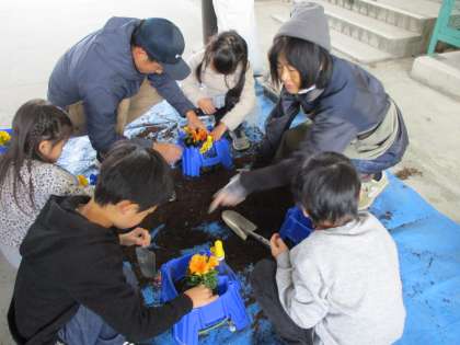 あさがおを育てていた鉢に、新しくパンジーのお花とチューリップの球根を植えました。農家の方が、植え方や育て方を丁寧に教えてくださいました。