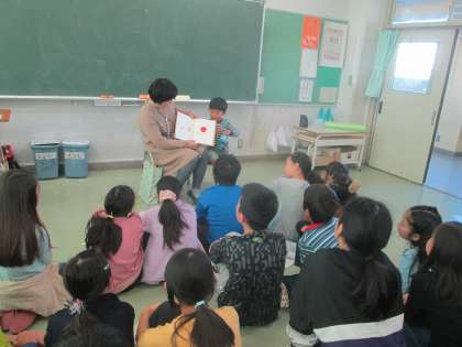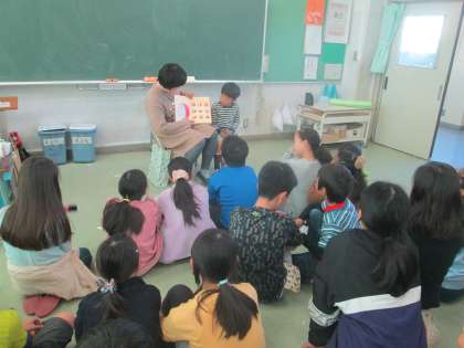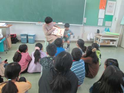 「りんごかもしれない」「もったいないことしてないか?」という本を読んでいただきました。どのような話なのか集中しながら、時には「クスッ」と笑いながら聞いていました。子どもたちは、お話の内容や挿し絵に楽しそうに反応し、時には笑いながら話を聞いていました。