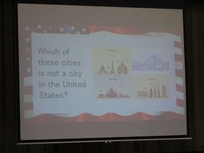 オリパラ学習の一つとして、異国の文化に触れる学びがあります。今日は、アメリカ大使館の方にきていただき、アメリカの文化や生活について教えていただきました。アメリカには、多くの州があること、人々が様々な言語を使用していること、人気のファーストフード店のこと、小学校生活の違いなど、クイズを交えながら楽しくお話していただきました。