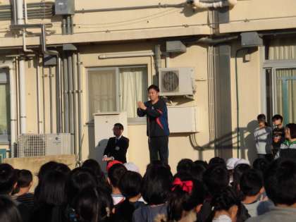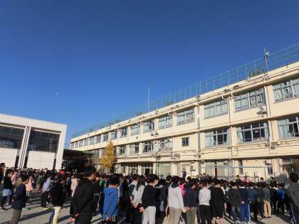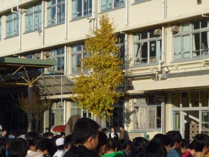 銀杏の木も色づいた、さわやかな晴天の下、校庭で全校朝会が行われました。