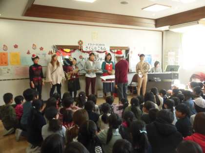 今日の中休み、ランチルームで本校PTAコーラス「さくら*ころん」さんによるクリスマスコンサートが行われました。お母さん方の迫力ある歌声に子どもたちも大喜び。おみやげもいただいて、一足早くクリスマス気分を味わえました。