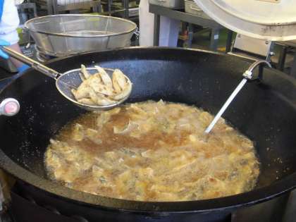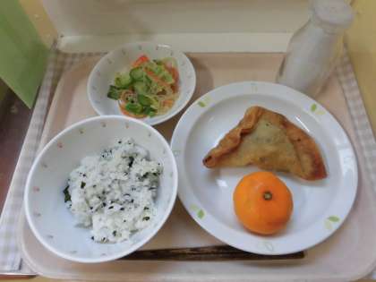 ☆今日の給食は、みんなが楽しみにしていた「ジャンボぎょうざ」です。調理員さんが1つ1つ丁寧に、ぎょうざのの皮にあんを包んで下さいました。給食室の大釜でこんがりと揚げて出来上がりです。