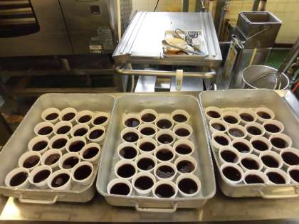 ☆今日は2学期最後の給食です。今日はスペシャルメニューで子ども達の大好きな献立になっています。ぶどうゼリーも調理員さんが1つ1つカップにゼリー液を入れて下さいました。そして、フライドチキンも給食室の大釜で揚げています。