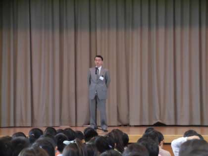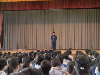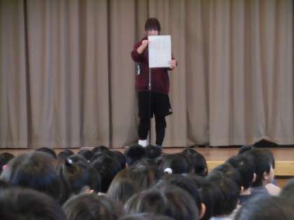 今日は、体育館で全校朝会を開きました。