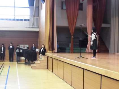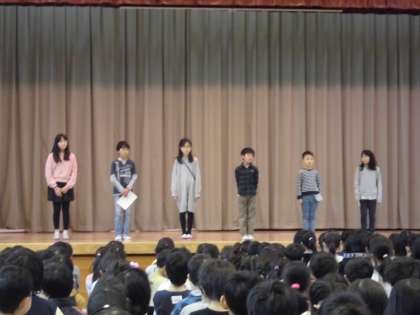 2学期の終業式を体育館で行いました。今日で2学期も終わりです。まず校長先生から、今日は「自分ががんばったことをほめる日、そしてお世話になった人に感謝する日」というお話がありました。自分ががんばったことを振り返ることは大切なことですね。次に2年生と5年生の代表の児童が、2学期にがんばったことを一人一人発表しました。みんなから温かい拍手が送られていました。最後に、音楽委員会の伴奏で元気に校歌を歌いました。