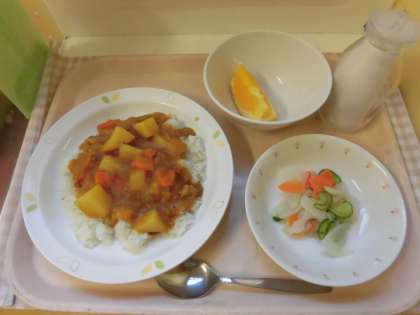 ☆今日から3学期の給食がスタートしました。今日は子どもたちの大好きな『チキンカレーライス』です。たくさんの野菜の使用しているので栄養満点です。おかわりもたくさんきていました。今学期も給食調理員と共にみんなに喜んでいただける給食を作っていきたいと思います。