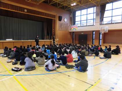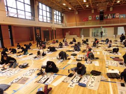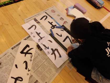 毛筆でのぞむ初めての席書会です。 子どもたちは一人ひとり、お手本をしっかりと見て筆を運び、心を込めて書きました。