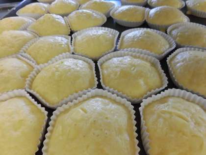 ☆今日のデザートは『チーズ蒸しパン』でした。もちろん給食室で生地から手作りです。かくし味として豆乳も入れているので栄養満点です。調理員さん達がカップに1つ1つ生地を入れてオーブンで蒸しました。