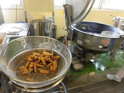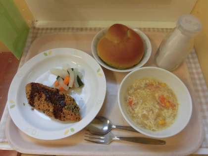 ☆今日の「あしたばパン」は東京都の伊豆諸島で栽培された、あしたばを使用しています。パンの生地にあしたば粉末を練り込んでいます。あしたばは、さわやかな香りと特有のほろ苦さが特徴で栄養価の高い健康野菜としても注目されています。シイラのフライも衣にごまを入れているので、カルシウムが豊富の1品です。