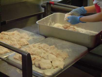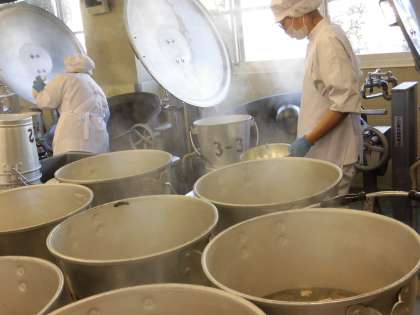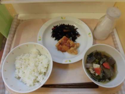 ☆今日は『ひじきの煮付け』です。ひじきは食物繊維も多く含まれ、カルシウムも豊富です。給食室の大釜でコトコト煮ました。よく味がしみこんだ、ひじきの煮付けをみんなで食べました。