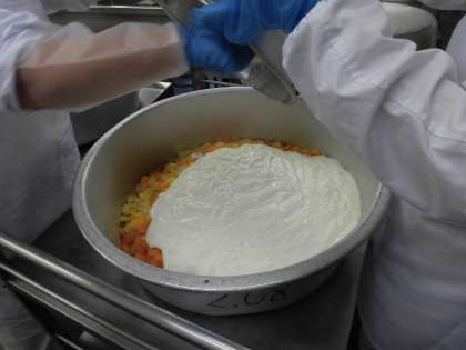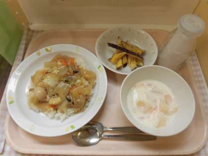 ☆今日は子ども達の好きな『フルーツヨーグルト』です。ヨーグルトの乳酸菌をとることで、風邪やインフルエンザの予防となります。給食室でフルーツ缶とたくさんのヨーグルトを混ぜて完成です。みんなで美味しく食べました。