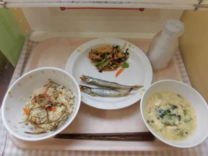 ☆今日は「焼きししゃも」です。ししゃもはクセがなくて食べやすく、プチプチとした卵の食感が特徴です。たくさんのししゃもを鉄板に並べ給食室のオーブンでこんがりと焼き、みんなで食べました。カルシウムが多く含まれている1品です。