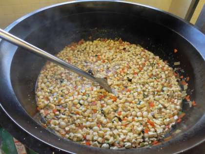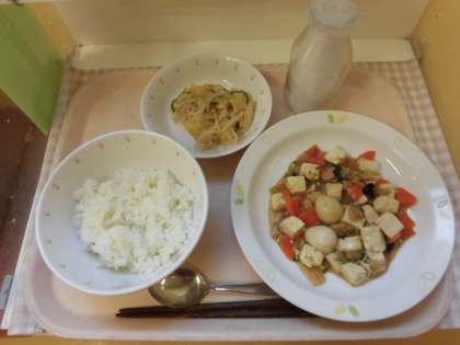 ☆今日の給食は、たくさんの具材が入った「豆腐の中華炒め」です。給食室の大釜でたくさん作りました。味付けも濃いめに作り、ごはんと一緒に食べると、更に美味しく食べることができます。子ども達にも食べやすく人気でした。