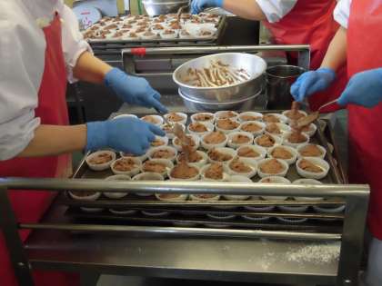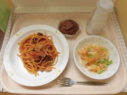 ☆今日は給食室手作りの「ココアマフィン」です。1つ1つカップに生地を入れて、オーブンで焼きました。ココアマフィンには、豆乳やおからを入れて作っています。全体的にやさしい味に仕上がり、子どもたちに好評でした。