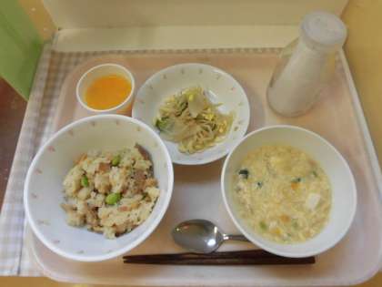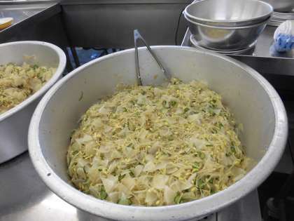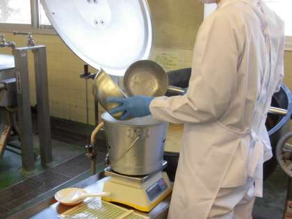 ☆今日のデザートは「みかんゼリー」です。ゼリーを食べやすくするために、オレンジジュースと砂糖そして、みかん缶を細かくしたものを入れて作りました。ゼリー液は調理員さん達が1つずつ丁寧にカップに入れています。手作りゼリーをみんなでいただきました。