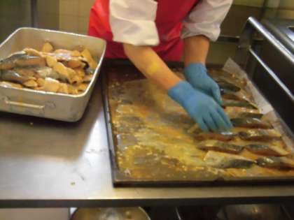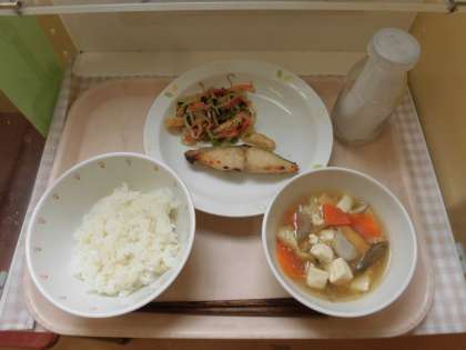 ☆今日の給食は「鰆(さわら)の西京焼きです」鰆は鯖(さば)と同じ青魚の仲間です。青魚には、血液をきれいにする、DHAやIPAが多く含まれています。成長期にはかかせない栄養もたくさん入っています。給食室では、西京みそを使い鰆を漬けこみ、オーブンで焼きました。