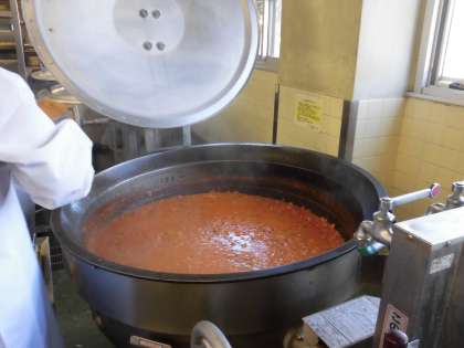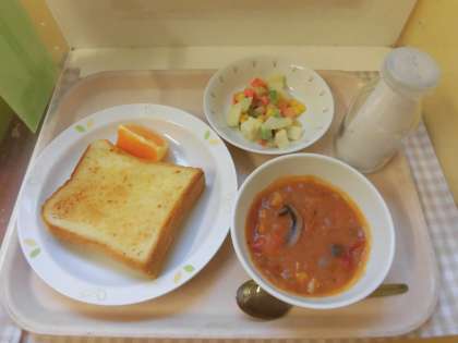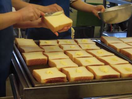 ☆今日の給食は「ガーリックトースト」です。ガーリックトーストはそのまま食べる他パスタや魚料理、肉料理の付け合わせとして出されます。給食室で食パンに1枚1枚、バターとおろしにんにくを合わせたものをぬり、オーブンで焼きました。