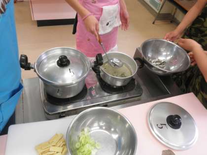 ご飯は鍋で炊き、味噌汁もしっかり煮干しを使っています。伝統的な日本のご飯の学習ですね。